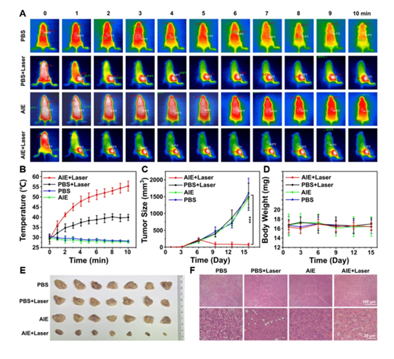 如圖5A所示,注射PBS(第一行)或TPATTINC NPs(第三行)后,腫瘤表面溫度保持穩(wěn)定,而激光單獨(dú)照射(第二行)時(shí),腫瘤表面溫度在10分鐘內(nèi)從29.4℃緩慢升高到38.1℃,TPA-TTINC NPs聯(lián)合激光照射(第四行)時(shí),腫瘤表面溫度在10分鐘內(nèi)從28.4℃迅速升高到55℃左右。不同組溫度隨時(shí)間的變化如圖5B所示。3個(gè)對照組的腫瘤體積穩(wěn)步增大,而“AIE+激光”組的腫瘤在觀察期內(nèi)受到明顯抑制和明顯縮小(圖5C)。如圖4E所示,對照組腫瘤大小相似,而“AIE+激光”治療的實(shí)驗(yàn)組腫瘤大小要小得多,說明TPA-TTINC NPs光熱治療效果強(qiáng)。H&E染色進(jìn)一步顯示“AIE+激光”組對腫瘤組織的治療效果,組織損傷較大,而其他組的形態(tài)和細(xì)胞核(藍(lán)色染色)保持正常(圖5F)。
