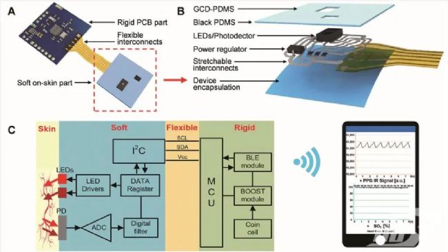 鑒于此,研究團(tuán)隊開發(fā)了一種用于非侵入式監(jiān)測術(shù)后游離皮瓣與再植斷指血運狀態(tài)的表皮生物傳感器。該傳感器由柔性前端、柔性互聯(lián)排線、硬質(zhì)主控后端組成,其中柔性前端可共形貼附在患者術(shù)后創(chuàng)面以采集監(jiān)測部位的光電容積脈搏波(PPG)信號,主控后端可進(jìn)行信號的進(jìn)一步處理及分析,并將監(jiān)測結(jié)果顯示在相應(yīng)的APP界面中。