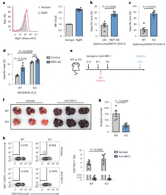 為了驗(yàn)證NgR1干擾NK細(xì)胞的抗腫瘤功能,該團(tuán)隊(duì)首先研究了NgR1在細(xì)胞表面的表達(dá),結(jié)果顯示NgR1在多種免疫細(xì)胞中均有表達(dá),如小鼠原代NK細(xì)胞、CD8 T細(xì)胞和EL4細(xì)胞系(圖1a),而NgR1的配體NogoA在各種癌細(xì)胞系中表達(dá)。隨后,對(duì)NgR1是否參與免疫細(xì)胞的細(xì)胞溶解過程進(jìn)行了研究,發(fā)現(xiàn)在NEP1-40(NgR1的拮抗肽)處理后,NgR1敲除小鼠(KO)的脾細(xì)胞比WT小鼠的脾細(xì)胞具有更高的細(xì)胞溶解能力(圖2c),并驗(yàn)證了NEP1-40的特異性(圖1d)。接下來,通過建立WT和KO小鼠肺轉(zhuǎn)移小鼠同基因模型(圖1e),進(jìn)一步證明了NK細(xì)胞中的NgR1對(duì)腫瘤生長(zhǎng)具有負(fù)調(diào)控作用。此外,為了研究NgR1缺陷導(dǎo)致的抗腫瘤效果的改善是否源于免疫成分的內(nèi)在變化,對(duì)WT和KO小鼠的免疫細(xì)胞群進(jìn)行了分析(圖1h)。結(jié)果表明,NgR1缺陷并不影響免疫細(xì)胞的組成,提示NgR1主要參與NK細(xì)胞的效應(yīng)功能。