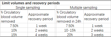 如果需要多點(diǎn)采血,每周最大采血量最好不超過(guò)循環(huán)血量的7.5%;每?jī)芍茏畲蟛裳坎怀^(guò)循環(huán)血量的10%。