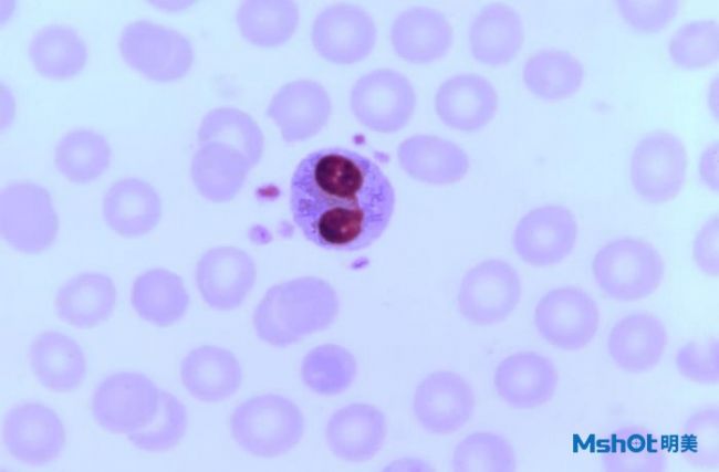 嗜堿性粒細(xì)胞,在顯微鏡下,細(xì)胞呈球形,顆粒具有異染性,甲苯胺藍(lán)染色呈紫紅色