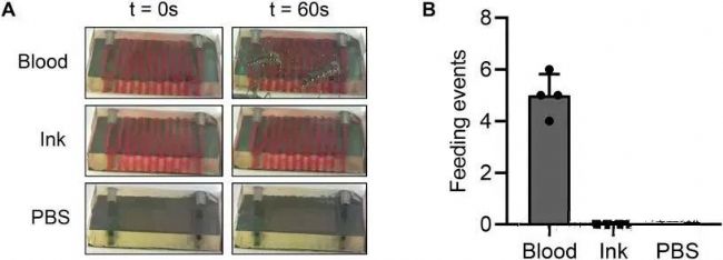 上圖顯示:水凝膠設(shè)計具有灌注液成分會對蚊子造成吸引血管段上方的順應(yīng)區(qū)域研究人員將受測蚊子放置在裝有攝像頭的透明塑料箱中,這可以清楚地觀測到昆蟲的行為,如每個站點的著陸頻率,它們的停留時間,它們是否咬人,還有它們花多長時間進食。研究人員測試了一些變量,包括應(yīng)用基于DEET或檸檬桉樹油的驅(qū)蟲劑的影響。但他們也進行了選餐實驗,觀察蚊子對去纖維蛋白血、紅色印度墨水或PBS的反應(yīng)。