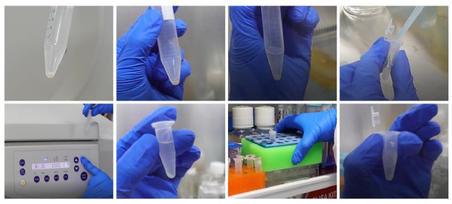 3、300g 4℃ 離心 5min 棄去上清,添加1ml類器官傳代培養(yǎng)緩沖液 G重懸移入 1.5ml 離心管,300g4℃ 離心 5min(如圖5)棄去液體。4、添加適量類器官凍存液 F,輕柔吹打重懸,以24孔細胞培養(yǎng)板為例:密度為2個孔凍存 1管(500個/ml密度凍存),每管體積1.4ml。