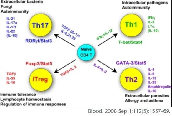 CD4 T細胞目前知道分為幾個主要子集TH1,TH2,TH17和Treg,TH=T Helper是輔助性T細胞。它們會分泌警示及激活其它免疫細胞的因子。TH1會分泌IFNγ活化受感染的巨噬細胞和樹突狀細胞,IL-2促進CD8+ CTL擴增和細胞溶解活性,GM-CSF與IL3偕同活化骨髓源性巨噬細胞分化等。TH2細胞通過IL-4、IL-5和IL-13提醒B細胞,粒細胞和肥大細胞,對于協(xié)調(diào)針對細胞外病原體(例如蠕蟲)的免疫反應非常重要。TH17細胞因其產(chǎn)生IL-17而得名,IL-17A和IL-17F促進靶組織生成促炎細胞因子,能招募固有免疫如中嗜中性粒細胞介導炎癥。