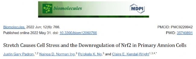 參考文獻(xiàn):Padron JG, Norman Ing ND, Ng PK, Kendal-Wright CE. Stretch Causes Cell Stress and the Downregulation of Nrf2 in Primary Amnion Cells. Biomolecules. 2022 May 31;12(6):766. doi: 10.3390/biom12060766. PMID: 35740891; PMCID: PMC9220942.