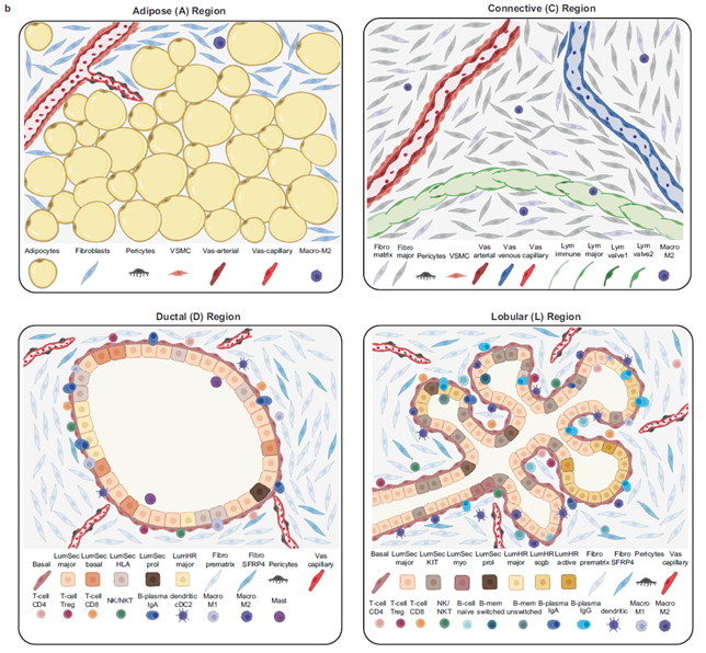 該研究不僅從空間生物學(xué)角度闡明了乳腺組織中各種細(xì)胞亞群之間的關(guān)系,還描繪出迄今為止最為全面的人類乳腺細(xì)胞圖譜,為研究乳房生理和疾病過程提供了詳細(xì)的單細(xì)胞空間多組學(xué)信息。