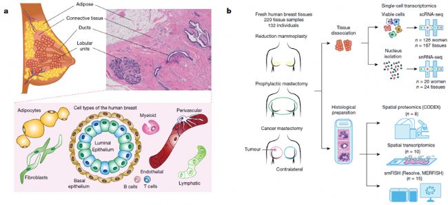 2016年HCA計(jì)劃啟動至今,空間多組學(xué)聯(lián)用被更廣泛地應(yīng)用在組織圖譜解析過程中,通過研究發(fā)育和生理/病理活動中的分子機(jī)制去探索不同類型的細(xì)胞聚集并形成組織的原因。本研究的目的是以單細(xì)胞分辨率繪制人類乳腺組織中存在的所有細(xì)胞類型、狀態(tài)及其空間分布多組學(xué)圖譜。
