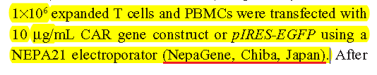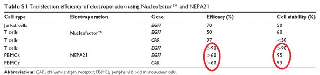 “我們比較了2種電穿孔系統(tǒng),即Nucleofector和NEPA21,其轉(zhuǎn)染效率和細胞存活率:NEPA21在人T細胞中轉(zhuǎn)染效率較高。因此,我們決定使用NEPA21轉(zhuǎn)染hCR-2基因到PBMCs。(表S 1)”