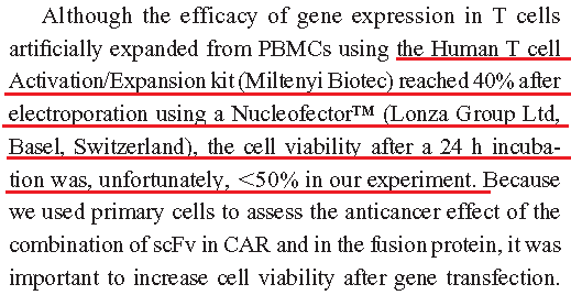 文中表明,“使用原代細胞核酸轉(zhuǎn)染儀(Lonza Group Ltd, Basel, Switzerland)轉(zhuǎn)染T細胞,轉(zhuǎn)染效率達到40%,但遺憾的是,在其實驗中,培養(yǎng)24小時后的細胞存活率為低于50%。由于我們使用原代細胞來評估單鏈抗體在CAR和融合蛋白中的聯(lián)合抗癌作用,因此在基因轉(zhuǎn)染后提高細胞存活率非常重要。”