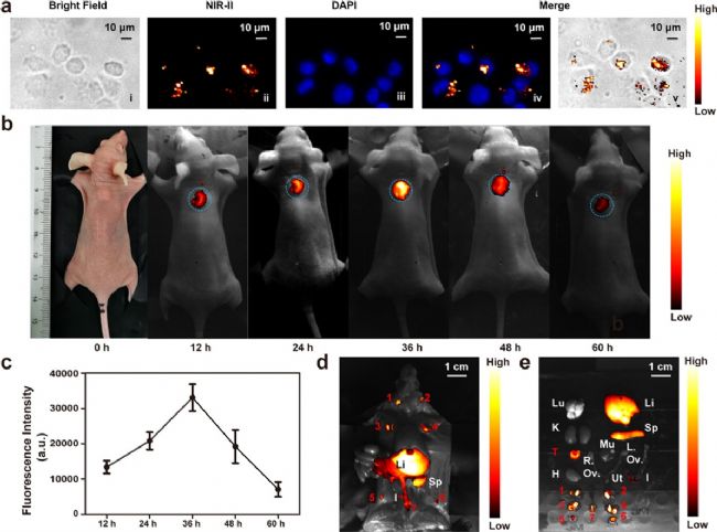 圖2. NIR-II NPs在卵巢癌細(xì)胞和皮下腫瘤中熒光成像。(a)與NIR-II NPs共培養(yǎng)后的癌細(xì)胞成像(b、c)注射NIR-II NPs后60小時(shí)內(nèi)皮下腫瘤的熒光成像及熒光強(qiáng)度變化(d、e)探針注射60小時(shí)后,荷瘤小鼠淋巴結(jié)的體內(nèi)成像及器官離體成像。