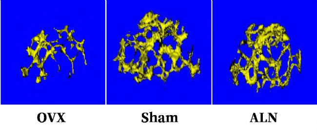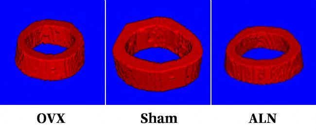 股骨正中剖面圖(圖3)顯示,OVX組與Sham組相比,松質(zhì)骨比較疏松, 骨小梁數(shù)量減少,骨小梁間間距擴大,骨小梁與骨小梁間的連續(xù)性與延展性較差。其中ALN組與Sham組相比,股骨松質(zhì)骨的骨微結(jié)構(gòu)質(zhì)量基本一致。從骨小梁橫切圖(圖4)顯示,OVX組骨小梁比較稀疏,Sham組和ALN組明顯更加緊密。從骨小梁3D圖(圖5)看出OVX組骨小梁數(shù)目明顯較少,Sham組和ALN組骨小梁數(shù)目明顯較多。從皮質(zhì)骨3D圖(圖6)和皮質(zhì)骨橫切(圖7)未發(fā)現(xiàn)OVX組與Sham組和ALN組的明顯差異。