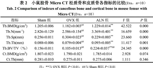 由表2可見,通過比較松質(zhì)骨和皮質(zhì)骨的骨形態(tài)參數(shù),發(fā)現(xiàn)ALN組的小鼠與OVX組小鼠比較,數(shù)值在Tb.BMD、Tb.N、Tb.Th 和Tb.BV/TV均有顯著性增加、Tb.Sp數(shù)值顯著性減少(P<0.01),證明ALN提高骨質(zhì)量,是通過增加骨密度和改善骨組織的結(jié)構(gòu)。ALN組與OVX組的Ct.BMD和Ct.Th比較無統(tǒng)計學(xué)差異(P>0.05)。