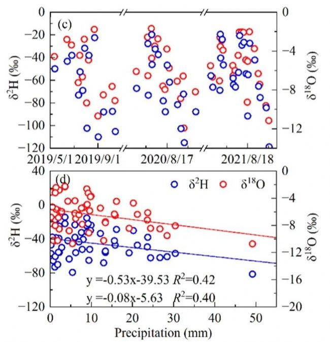 基于此,為確定毛烏素沙地圪丑溝小流域(38°11′–38°53′ N,109°21′–110°03′ E)不同林齡(6年、12年和18年)人工沙柳水分利用模式的季節(jié)變化和控制因素,揭示老化沙柳枯死的潛在機制,理解土壤水-植物的關(guān)系和人工植被的生態(tài)適應(yīng)性。來自中國科學(xué)院地理科學(xué)與資源研究所的研究者們于2019-2021年5-10月(5、6、10月為旱季;7、8、9月為雨季)植物生長季進(jìn)行了相關(guān)研究。試驗開始前,作者采集了土壤樣品,確定其土壤顆粒組成,總N含量(TN)及總P含量(TP)。采集了根系樣品,確定植物根系分布。試驗期,采集了0-20 cm、20-40 cm、40-60 cm、60-90 cm、90-120 cm、120-150 cm、150-200 cm、200-250 cm及250-300 cm土壤樣品,將其分為兩部分,一部分用來測定同位素,一部分用來測定土壤含水量(SWC)。同時采集了植物木質(zhì)部樣品。并于降水事件后收集降雨,采集降水量和氣溫數(shù)據(jù)。通過計算土壤干燥化指數(shù)(SDI)描述土壤水分虧缺狀態(tài)。利用LI-2000植物土壤水分抽提系統(tǒng)(北京理加聯(lián)合科技有限公司)提取木質(zhì)部和土壤中的水分。利用Picarro L2130-i水同位素分析儀確定土壤水及降水的δ18O和δ2H。同時確定木質(zhì)部水的δ18O和δ2H。最后通過MixSIAR模型區(qū)分并量化植物水源。
