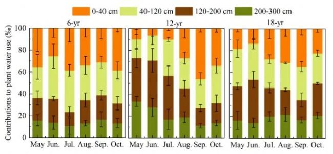 在整個生長季,6年沙柳>60%的水源來自于0–120 cm土壤層。相比之下,12年和18年沙柳具有更大程度的生態(tài)可塑性,分別從旱季120-300 cm(71.93%)和40-200 cm(68.91%)水源轉(zhuǎn)變到雨季的0-120 cm(65.09%和56.14%)水源。根系和土壤含水量垂直分布的變化是影響不同林齡沙柳水分利用模式季節(jié)性變化的主要因素。18年林分中,嚴(yán)重的土壤干涸和死根削弱了老化沙柳的生態(tài)可塑性,降低了其吸收深層水(200-300 cm)的能力,從而導(dǎo)致沙柳退化。因此,野外管理措施,例如(i)通過沙柳退化枝條覆蓋地面以減少土壤水蒸發(fā);(ii)使成熟沙柳稀疏以減少水分消耗;(iii)通過對最佳植物密度或生物量進(jìn)行建模來確定植被閾值,以指導(dǎo)所研究地區(qū)的未來植被恢復(fù)。在這項研究中,針對沙柳擬議的管理實踐可以為世界其他沙漠地區(qū)相似林齡人工恢復(fù)植物的水分利用策略提供參考。