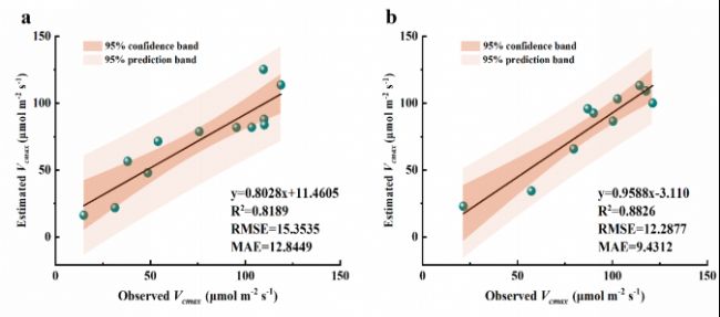與實測Vcmax進行比較,該估算模型RMSE值為14.04 μmol m-2s-1,而簡單線性回歸方法的RMSE值為22.32 μmol m-2s-1,估算精度提高了約40%。此外,該研究還基于不同站點的實測結(jié)果,對估算模型的準確性和普適性進行了進一步驗證。研究表明估算模型表現(xiàn)良好,能夠?qū)Σ煌鷳B(tài)點、不同水稻品種的光合功能性狀進行有效估算。
