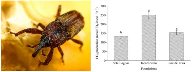 巴西維索薩聯邦大學Raul Narciso C. Guedes教授團隊研究了殺蟲劑敏感的(來自Sete Lagoas)和抗藥性種群(來自Jacarezinho和Juiz de Fora)成體玉米象發(fā)育速率、呼吸速率和脂肪體細胞形態(tài)學等指標。實驗中的呼吸速率測試使用了SSI昆蟲呼吸代謝系統(tǒng),結果顯示(上圖右),來自Jacarezinho的玉米象呼吸速率顯著高于其它兩個種群。來自Jacarezinho和Juiz de Fora的殺蟲劑抗性種群之間的適應性差異可能是由于其抗藥性的遺傳起源差異。