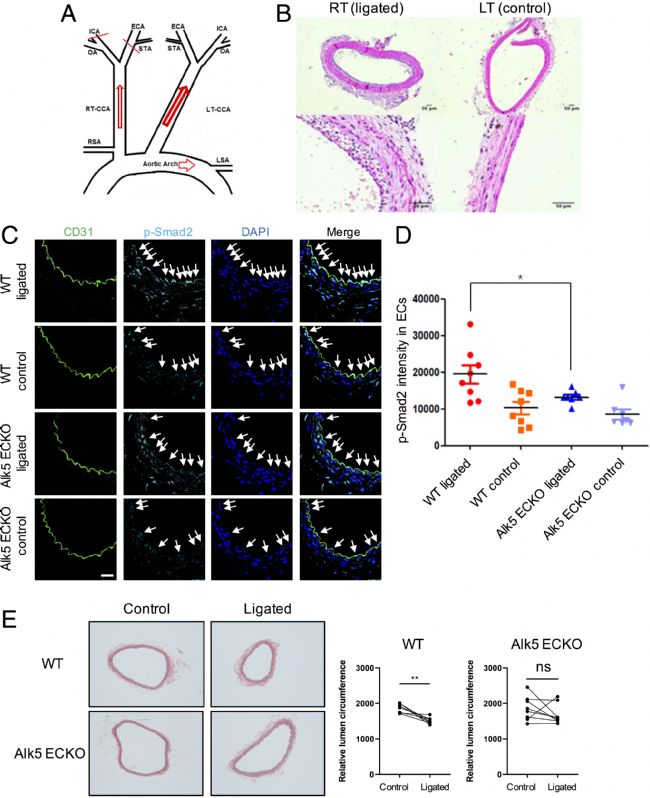 耶魯大學(xué)心血管研究中心、羅格斯大學(xué)高級生物技術(shù)和醫(yī)學(xué)中心、上海市免疫學(xué)研究所等研究團隊以前的研究表明,Smad1/5在生理設(shè)定值附近的激活和核易位是由其受體Alk1和內(nèi)皮糖蛋白觸發(fā)的。流動激活是通過對循環(huán)TGF-β家族配體BMP9和BMP10的敏感性增加約20倍介導(dǎo)的。與血管穩(wěn)定的作用一致,這些受體的突變或缺失會誘發(fā)脆弱且容易破裂的血管畸形。其他研究表明,相關(guān)的Smad2/3通路也被血流激活,但是,在這種情況下,激活被生理層流FSS抑制,并由振蕩FSS激活,這是動脈粥樣硬化易感區(qū)域的典型特征。這些結(jié)果促使該團隊研究了Smad2/3信號在血流依賴性血管重塑中的作用。