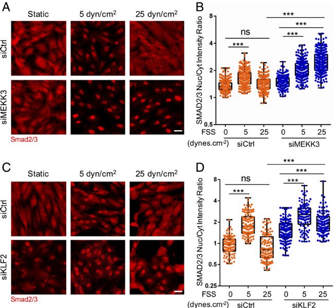 Smad2/3 的雙相流動激活表明,在高 FSS 下激活的另一種通路拮抗 p-Smad2/3 核易位。敲除小鼠MEKK3通過激活TGFβR1-Smad2/3通路觸發(fā)自發(fā)的向內(nèi)動脈重塑。MEKK2 和 MEKK3 是在高 FSS 下誘導(dǎo)轉(zhuǎn)錄因子 Klf2 表達的途徑中的上游組分。該通路介導(dǎo)eNOS和其他促進血管舒張和穩(wěn)定血管系統(tǒng)的基因表達。因此,研究了siRNA介導(dǎo)的MEKK3缺失對Smad2/3信號流動激活的影響。敲低MEKK3在低剪切下影響不大,但在高FSS下消除了Smad2/3核轉(zhuǎn)運的抑制(圖3 A、B)。因此,高-流量抑制Smad2/3功能需要MEKK3。
