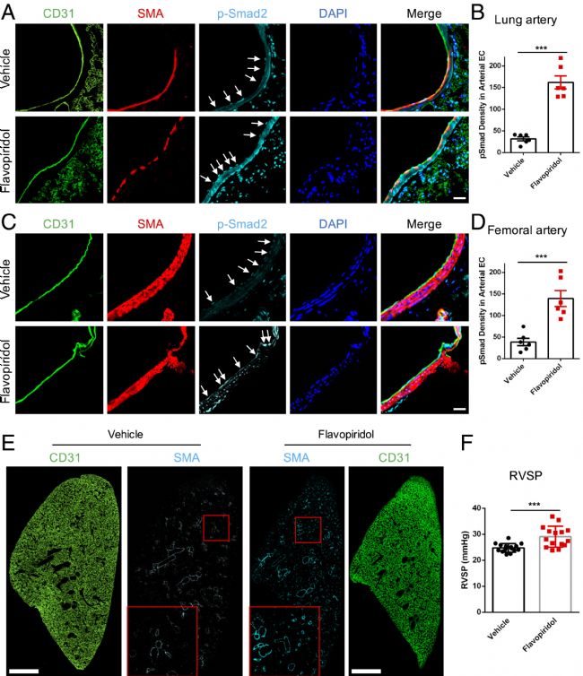 最后,研究了該通路是否在體內(nèi)起作用。黃酮吡醇已被用于癌癥患者的人體臨床試驗。然而,這種化合物在循環(huán)中的半衰期很短(∼30分鐘)。注射高劑量(7.5 mg/kg)黃酮吡啶醇的小鼠肺動脈和股動脈的內(nèi)皮顯示p-Smad2核染色增加數(shù)倍(圖4 A-D)。這些結(jié)果證實了CDKs在動脈血流下阻止Smad2/3核易位中的作用。接下來,討論了這種處理是否會引起血管重塑。結(jié)果發(fā)現(xiàn),注射3天中的2天的小鼠存活率更高,因此,根據(jù)該方案注射3周。肺血管系統(tǒng)在MEKK3 敲低后最容易重塑。對整個肺切片的檢查顯示,血管的平滑肌肌動蛋白(SMA)覆蓋率顯著增加(圖4 E),右心室血壓顯著升高(圖4 F)。