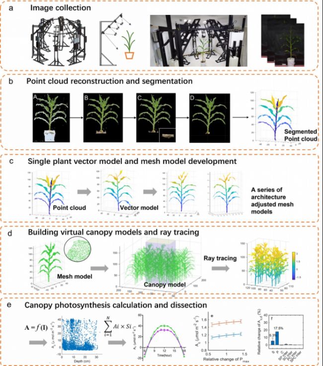 圖 13D冠層光合建模分析流程。該流程包括幾個(gè)步驟,(a)使用MVS64系統(tǒng)進(jìn)行圖像采集,(b)點(diǎn)云重建、處理和分割,(c)基于分割的點(diǎn)云建立單株向量模型,并生成虛擬植物的網(wǎng)格模型,(d)建立冠層模型并進(jìn)行光線追蹤模擬冠層光環(huán)境,(e)冠層光合速率計(jì)算、參數(shù)響應(yīng)模擬分析和多因素冠層光合貢獻(xiàn)率解析。