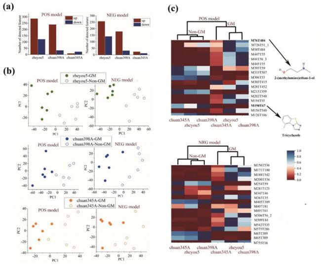 圖2 轉(zhuǎn)基因和非轉(zhuǎn)基因水稻種子的非靶向代謝組學(xué)分析結(jié)果(a)不同代謝物的統(tǒng)計直方圖;(b)基于PCA的代謝物散點圖;(c)前15個最大差異的代謝物質(zhì)熱圖。顏色條代表不同的代謝物濃度水平