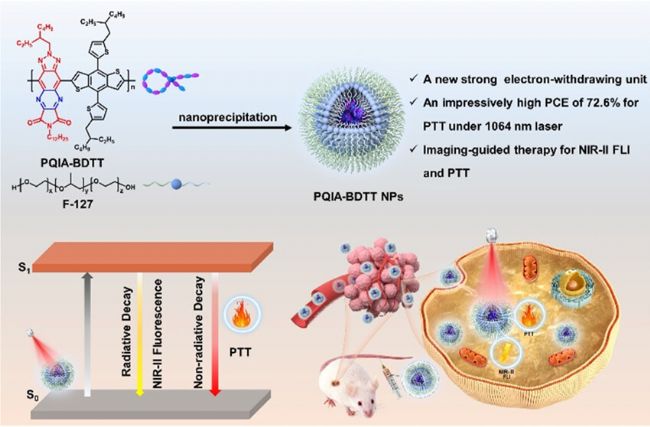 多功能診療試劑在提高光熱治療和腫瘤熒光成像的療效方面起著至關(guān)重要的作用。然而,它們需要將復(fù)雜的部件集成到單個治療診斷系統(tǒng)中,并且它們在NIR-II區(qū)域中的響應(yīng)受到光敏劑的波長的限制。為了解決這個問題,作者開發(fā)了一種新型的喹喔啉酰亞胺半導(dǎo)體聚合物(命名為PQIA-BDTT)。
