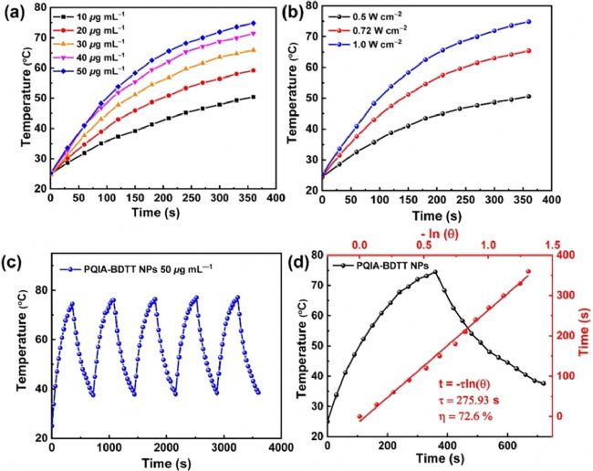 圖2. PQIA-BDTT NPs的光熱性質(zhì)。(a) 在激光照射(1064 nm,1.0W cm-2)下在各種濃度下持續(xù)6分鐘和(b) 在50 μg mL-1濃度下在各種激光功率密度下持續(xù)6分鐘。(c) 輻照和五次冷卻運行后PQIA-BDTT NPs的循環(huán)溫度變化。(d) PQIA-BDTT NPs(50 μg mL-1)在激光照射(1064 nm)下6分鐘的加熱和冷卻曲線,以及冷卻期的線性時間數(shù)據(jù)與−ln(θ)。