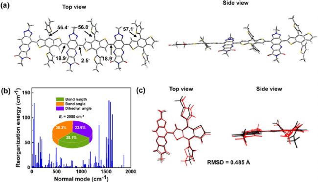 圖3. (a) PQIA−BDTT的簡化重復(fù)單元(n = 3)的優(yōu)化構(gòu)象。(b) 計算的重組能(Er)與最佳結(jié)構(gòu)的正常模式波數(shù)。插圖:鍵長、鍵角和二面角對總Er的貢獻(xiàn)。(c) 密度泛函理論計算的S0(黑色)和S1(紅色)電子狀態(tài)的最小能量幾何。
