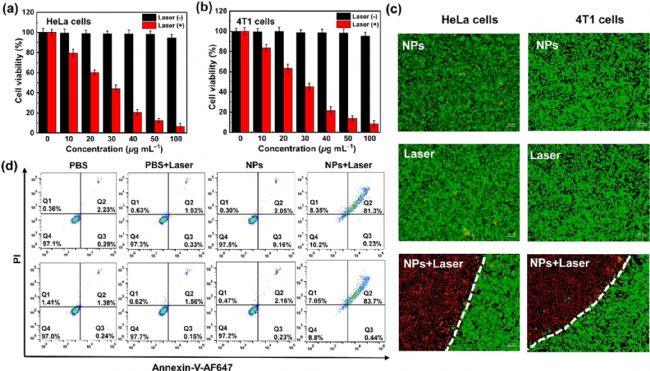 圖4. HeLa(a)和4T1(B)細(xì)胞在用不同濃度的PQIA-BDTT NPs孵育24小時后的CCK-8測定,有或沒有激光照射(1064 nm,1.0 Wcm-2,3分鐘)。(c) 不同處理后鈣黃綠素AM(綠色)和碘化丙啶(紅色)共染色的HeLa(左)和4 T1細(xì)胞(右)的熒光圖像。在用PQIA-BDTT NPs(50 μg mL-1)孵育細(xì)胞后,進(jìn)行NIR-II光照射(1064 nm,1.0W cm-2,3分鐘)處理。(d)用膜聯(lián)蛋白V/碘化丙啶染色的HeLa(上)和4 T1(下)細(xì)胞的凋亡的流式細(xì)胞術(shù)分析; PQIA-BDTT NPs的濃度為50 μg mL-1。