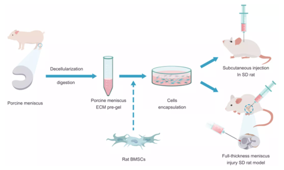 本項(xiàng)研究從仿生學(xué)得到啟發(fā),用豬半月板的內(nèi)側(cè)1/3部分組織(白區(qū))通過脫細(xì)胞化制作一種組織特異性細(xì)胞外基質(zhì)(ECM),并將其制備成可注射用的水凝膠,再將該ECM負(fù)載骨髓間充質(zhì)干細(xì)胞(BMSCs)形成具有生物活性的活體凝膠材料用于半月板損傷修復(fù)(圖1)。