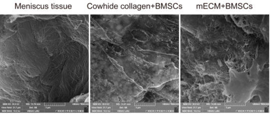 體外培養(yǎng)21天后發(fā)現(xiàn)該ECM與BMSCs的復(fù)合物的形貌結(jié)構(gòu)更接近正常的半月板組織,這說明該ECM更利于半月板損傷的修復(fù)(如圖3)。