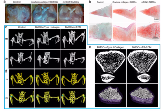 團(tuán)隊(duì)繼而制作了一個(gè)位于半月板白區(qū)全層的半月板損傷SD大鼠模型,將負(fù)載有BMSCs的組織特異性ECM注射到模型半月板損傷部位,兩個(gè)月后發(fā)現(xiàn)該活體生物材料能夠顯著促進(jìn)半月板的修復(fù),同時(shí)極大地保護(hù)了關(guān)節(jié),抑制了鈣質(zhì)流失和骨關(guān)節(jié)炎的發(fā)生(圖5)。