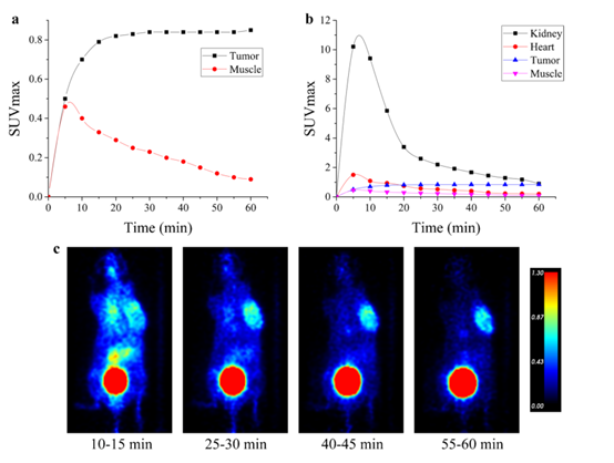 圖4注射[68Ga] Ga-P137后60分鐘內(nèi)腫瘤和肌肉(a)及相關(guān)器官(b)的時(shí)間-活性曲線。BALB/c nu小鼠攜帶22Rv1腫瘤異種移植體的microPET成像的全身冠狀切片(c)。數(shù)據(jù)為平均標(biāo)準(zhǔn)化攝取值(SUVmean)