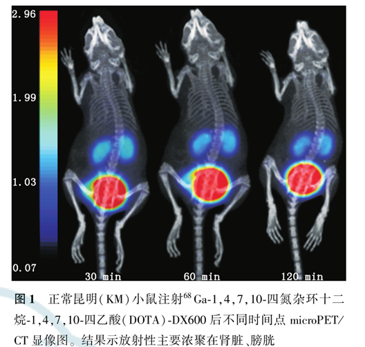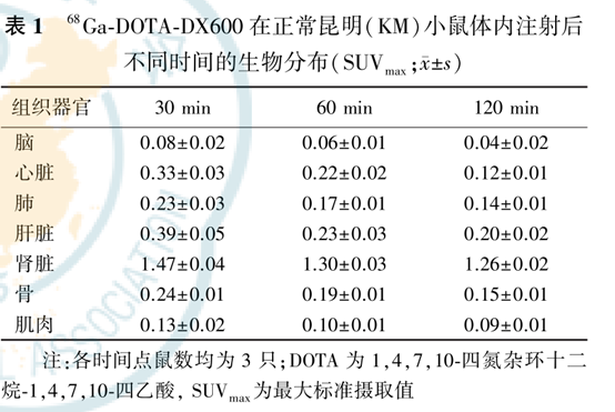 正常BALB/C 裸鼠于右上肢腋下接種穩(wěn)轉(zhuǎn)的宮頸癌Hela-ACE2細(xì)胞(106個(gè)/0.1ml)待腫瘤長(zhǎng)至0.7-1.0cm 時(shí)進(jìn)行實(shí)驗(yàn)。正常KM鼠以及荷瘤裸鼠均在尾靜脈注射約7.4MBq/200μl 放射性藥物。KM鼠(n=3)于注射后30、60和120min 進(jìn)行顯像,荷瘤裸鼠(n=3)于注射后30和60min進(jìn)行成像,觀察68Ga-DOTA-DX600在2種小鼠體內(nèi)的放射性分布情況。封閉組(n=3)除注射放射性藥物外,還注射100μgDX600;脫氧葡萄楊(FDG)組(n=3)作為陰性對(duì)照組提前6h禁食,尾靜脈注射FDG7.4MBq/200μl;封閉組與FDG組采集時(shí)間均為60分鐘。顯像前及顯像過(guò)程中均使用體積分?jǐn)?shù)2%異氟烷對(duì)小鼠進(jìn)行麻醉。PET單次掃描時(shí)間為900s,圖像使用Avatar軟件進(jìn)行顯像,對(duì)主要臟器進(jìn)行感興趣區(qū)(ROI)勾畫,記錄勾畫區(qū)域的最大標(biāo)準(zhǔn)攝取值(SUVmax),并計(jì)算腫瘤組織與正常組織SUVmax比值(即靶/非靶比值)。