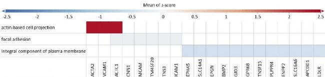 轉(zhuǎn)錄組分析顯示,與未處理的PDLSC相比,張力處理的PDLSC中有1336個(gè)基因差異表達(dá),其中,543個(gè)基因顯著上調(diào),793個(gè)基因顯著下調(diào)。經(jīng)過(guò)p值調(diào)整后,剩下124個(gè)DEG至少具有≥1.0的效應(yīng)值。研究發(fā)現(xiàn),124個(gè)DEG中有33個(gè)DEG參與了38個(gè)不同的生物過(guò)程(圖1),20個(gè)DEG參與了3個(gè)細(xì)胞成分(圖2),19個(gè)DEG參與了11個(gè)分子功能(圖3),10個(gè)DEG參與了12個(gè)KEGG通路,5個(gè)DEG參與了4個(gè)Reactome通路和18個(gè)DEG參與了15個(gè)WikiPathways 。