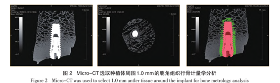 Micro-CT(Venus VNC-102,平生醫(yī)療科技有限公司)掃描標(biāo)本,掃描參數(shù)為電壓90 KVp,電流0.06 mA,像素20 μm,保持種植體與掃描平面垂直,掃描完成后行三維重建。選取各時間點各組種植體周圍1.0 mm鹿角組織,進(jìn)行骨計量學(xué)分析,見圖2。主要分析指標(biāo):種植體-骨結(jié)合率(bone-implant contact,BIC)、BV/TV、Tb. N、Tb.Th和Tb. Sp等。