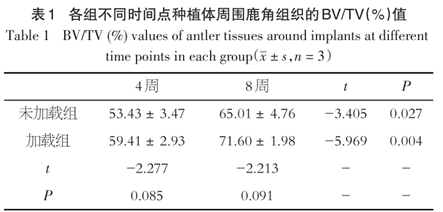 種植體周圍鹿角組織的影像學(xué)觀察,見圖3。隨著術(shù)后時間的延長,種植體周圍的鹿角組織逐漸長入種植體螺紋,種植體周圍鹿角組織的新生骨數(shù)量逐漸增加,加載組種植體周圍鹿角組織較未加載組致密,特別是8周加載組可見種植頸部大量高密度的鹿角組織。