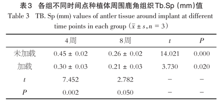 Tb.Sp值結(jié)果 隨著術(shù)后時間的延長,未加載和加載組的Tb.Sp值均逐漸減小,其差異具有統(tǒng)計學(xué)意義(P < 0.05)。同一時間點,加載組的Tb.Sp值均小于未加載組,其中4周時未加載和加載組的Tb.Sp值差異具有統(tǒng)計學(xué)意義(P < 0.05),見表3。