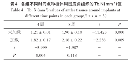 Tb.N值結(jié)果 隨著術(shù)后時間的延長,未加載和加載組的Tb.N值均逐漸增加,其中未加載組4周和8周的Tb.N值差異具有統(tǒng)計學(xué)意義(P < 0.05)。同一時間點,加載組的Tb.N值均大于未加載組,其中4周時加載組和未加載組的 Tb.N 值差異具有統(tǒng)計學(xué)意義(P <0.05),見表4。