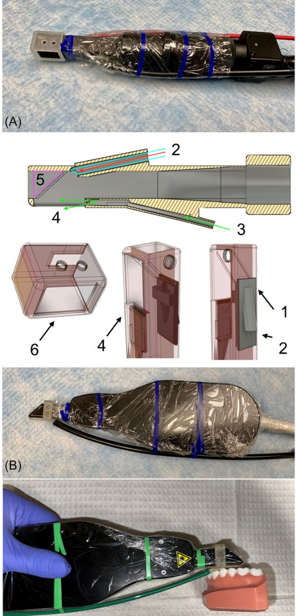 本研究采用了SWIR反射成像裝置以及CP-OCT裝置。圖1A中示出了完全組裝的SWIR反射成像裝置的圖像。該裝置由三個(gè)3D打印的可高壓滅菌附件、一個(gè)用于傳輸SWIR光的直徑為1 mm的光纖、一個(gè)空氣噴嘴、一個(gè)由兩個(gè)透鏡組成的組件以及一個(gè)連接到微型InGaAs相機(jī)的可調(diào)節(jié)光圈組成。本研究使用的CP-OCT系統(tǒng)是從Santec購(gòu)買的型號(hào)IVS-3000-CP。CP-OCT手柄的圖像如圖1B所示,它已被用于多種體內(nèi)齲齒成像研究。