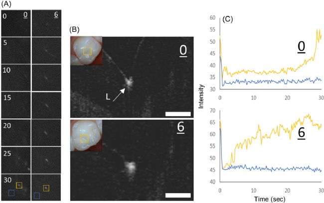 圖4.(A)干燥過(guò)程中0和6個(gè)月時(shí)0 - 30 s病變區(qū)域的SWIR圖像(病變區(qū)域在黃色框中,健全區(qū)域在藍(lán)色框中)(B)0個(gè)月和6個(gè)月時(shí)的CP-OCT小窩溝病變圖像 (C) SWIR反射強(qiáng)度隨時(shí)間的變化曲線
