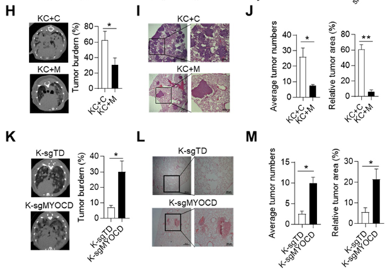 (H) 在KC小鼠模型中,MYOCD的過度表達(dá)減緩了肺腫瘤的發(fā)生。在CT掃描之前,給KC+C和KC+M小鼠喂食DOX食物約12周。肺癌小鼠的CT圖像KC+C小鼠(n=3)和KC+M小鼠(n=3)(左);腫瘤負(fù)荷的量化(右圖)。(I) 從KC+C和KC+M小鼠獲得的肺組織H&E染色的代表性圖像。(J) 統(tǒng)計(jì)平均腫瘤數(shù)(左)和相對(duì)腫瘤面積(右)。(K) MYOCD基因敲除促進(jìn)lsl-KrasG12D小鼠肺腫瘤的發(fā)生。K-sgTD小鼠(n=10)和肺癌小鼠(n=10)的肺MRI圖像(左);腫瘤負(fù)荷的量化(右圖)。(五十) K-sgTD和K-sgMYOCD肺組織H&E染色的代表性圖像。(M) 平均腫瘤數(shù)量(左圖)和相對(duì)腫瘤面積(右圖)的量化。