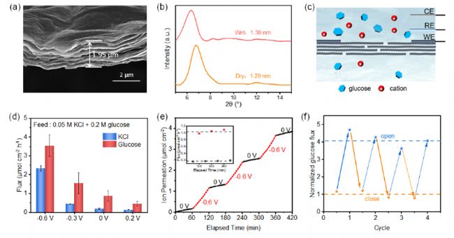 近年來,納米多孔材料在超級(jí)電容器及電容除鹽等領(lǐng)域得到了廣泛深入的研究。其中,由MXene交錯(cuò)堆疊形成的層狀膜材料展現(xiàn)了巨大的潛力。作者利用層狀MXene膜具有的亞納米級(jí)通道尺寸和高比電容性質(zhì),通過電位深度調(diào)控了通道內(nèi)的離子數(shù)目與分布。有趣的是,作者發(fā)現(xiàn)電化學(xué)過程也可以改變通道中水分子的排布與運(yùn)動(dòng),進(jìn)而影響物質(zhì)在通道內(nèi)的輸運(yùn)。通過耗散型電化學(xué)石英晶體微天平、低場(chǎng)核磁共振譜及分子動(dòng)力學(xué)模擬,作者解析了水分子在亞納米通道內(nèi)的排布與運(yùn)動(dòng)及其電壓響應(yīng)特征,從而揭示了通道內(nèi)葡萄糖電壓門控輸運(yùn)的機(jī)理:當(dāng)電位降低,孔道內(nèi)水分子貼近孔道壁分層取向排列,在通道中心形成由水的氧原子組成的傳輸通路,導(dǎo)致葡萄糖以一定的取向態(tài)快速擴(kuò)散。