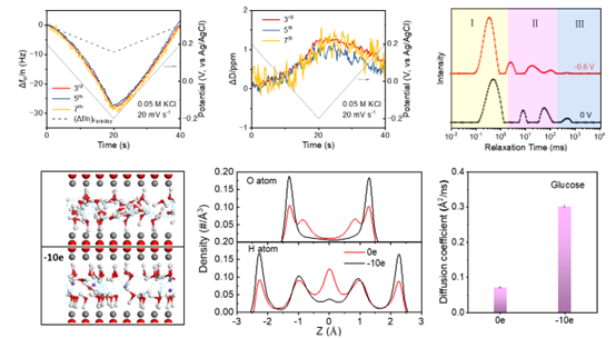 圖2 電化學(xué)聯(lián)用耗散型石英晶體微天平、低場(chǎng)核磁和分子動(dòng)力學(xué)模擬解析葡萄糖運(yùn)輸?shù)碾娢豁憫?yīng)機(jī)制
