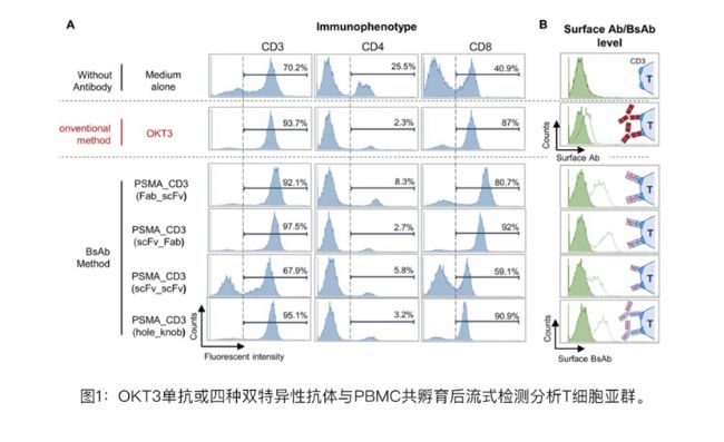 - 從健康供體的血液中分離人PBMC,并分別與四種類(lèi)型的BsAb或傳統(tǒng)的小鼠抗CD3抗體(OKT3)共培養(yǎng),14天后分化擴(kuò)增出特異性的CD3+CD8+T細(xì)胞(圖1)。