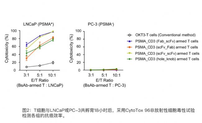 OKT3是一種CD3單克隆抗體,用于促進(jìn)T細(xì)胞增殖和分化。將OKT3或特異性合成的PSMA/CD3雙抗與添加了IL-2的PBMC共孵育,分別得到增殖分化好的T細(xì)胞。將OKT3-T細(xì)胞或雙特異性T細(xì)胞(anti-PSMA/anti-CD3 BsAbs)與LNCaP細(xì)胞共培養(yǎng),驗(yàn)證雙特異性T細(xì)胞在體外對(duì)腫瘤的殺傷作用[2]。