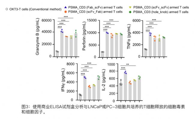 - 雙特異性T細(xì)胞較OKT3-T細(xì)胞展示出更強(qiáng)的對(duì)LNCaP細(xì)胞的殺傷性(圖2),釋放更高量的細(xì)胞因子(IL-2、INF-γ和TNF-α)和細(xì)胞毒素(穿孔素和顆粒酶B)(圖3)。