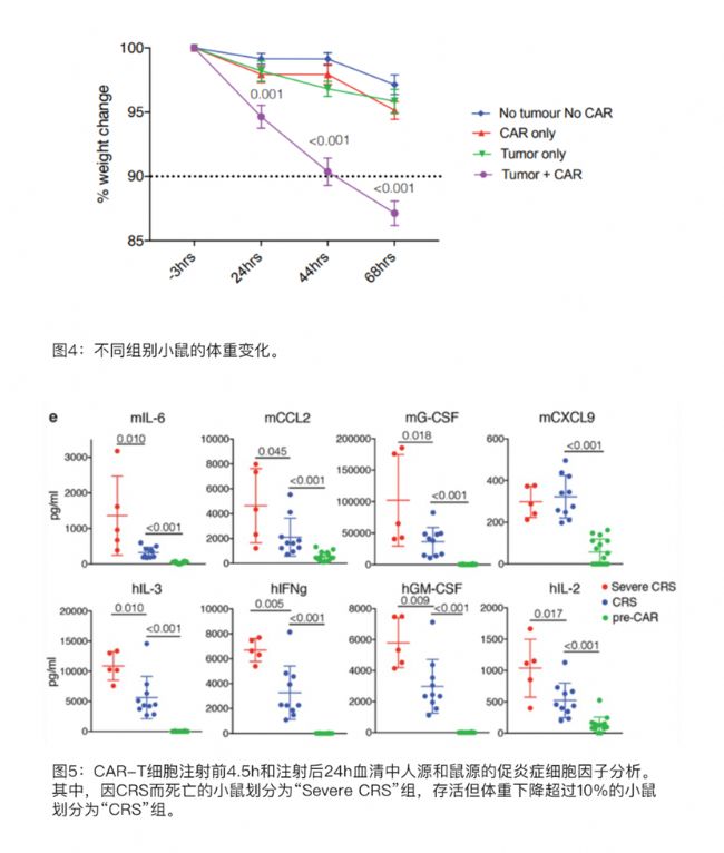 - 荷瘤小鼠回輸CAR-T細(xì)胞后,體重明顯下降(圖4),整體細(xì)胞因子的表達(dá)水平與生存率及CRS的嚴(yán)重程度密切相關(guān)(圖5)。
