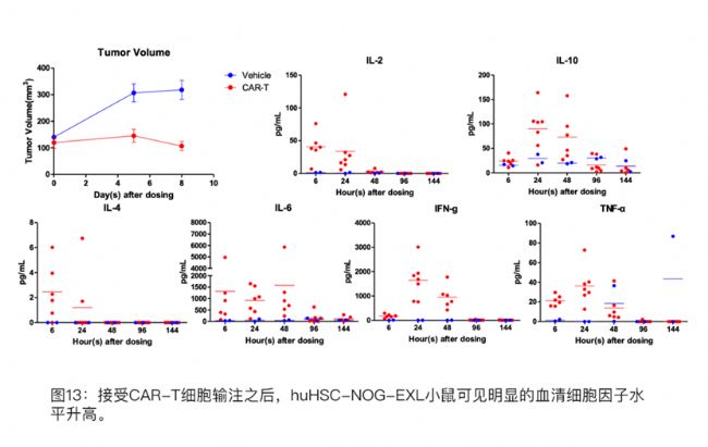 采用常規(guī)免疫缺陷小鼠荷瘤模型通常情況下觀察到的細(xì)胞因子釋放是有限的 , 不能有效地評(píng)估CAR-T 細(xì)胞治療的安全性。研究結(jié)果表明[5],當(dāng)在臨床前實(shí)驗(yàn)研究或預(yù)測(cè) CAR-T 細(xì)胞產(chǎn)品的細(xì)胞因子釋放強(qiáng)度時(shí),相比于常規(guī)的荷瘤小鼠,免疫重建的NOG-EXL小鼠是更適合的模型。研究者使用huHSC-NOG-EXL小鼠,給予腫瘤負(fù)荷并輸注CAR-T細(xì)胞后,可見(jiàn)明顯的各類(lèi)細(xì)胞因子的釋放(圖13),其中 IL-6 的最高釋放個(gè)體達(dá)到6000 pg/mL 水平。但細(xì)胞因子釋放的時(shí)機(jī)同臨床相比較早,持續(xù)的時(shí)間也較短。