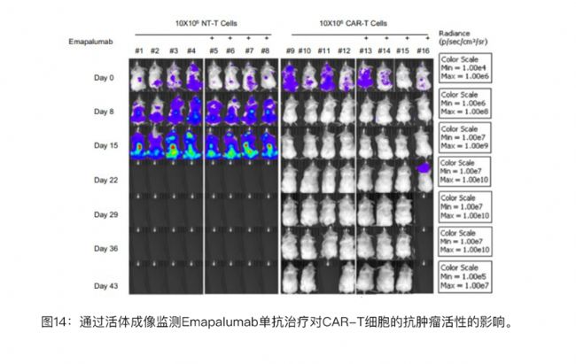 - NSG小鼠模型中,Emapalumab單抗治療不影響CAR-T細(xì)胞的抗腫瘤活性(圖14)。